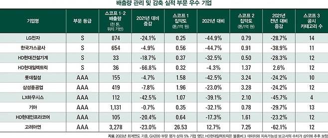 올해 배출량 관리 및 감축 실적 부문 평가에서는 LG전자, 한국가스공사, HD현대건설기계, HD현대일렉트릭이 상위 2.5%에 해당하는 S 등급을 받았다. 롯데칠성, 삼성중공업, LX하우시스, 기아, HD현대인프라코어, 고려아연은 상위 5%에 해당하는 AAA 등급을 받았다. 지속가능경영 보고서와 블룸버그 데이터 간 수치 차이로 인해 재입력 과정을 거친 HD현대인프라코어를 제외하면 모든 기업이 2021년 대비 온실가스배출량을 줄였으며, 배출 집약도도 개선됐다.