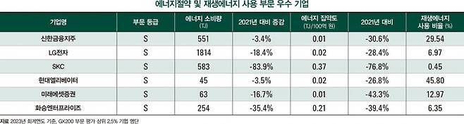 올해 에너지절약 부문에서 S 등급을 받은 기업은 신한금융지주, LG전자, SKC, 현대엘리베이터, 미래에셋증권, 화승엔터프라이즈다. 국가 탄소중립 녹색성장 기본계획에 따라 재생에너지 수요가 급증하는 상황에서 에너지 사용량을 줄이고 재생에너지 비율을 확대한 기업이 S 등급에 포함됐다.
