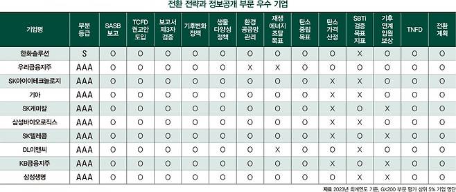 올해 평가를 기반으로 841개 코스피 상장사 중 전환 전략과 정보공개 부문 13개 항목 중 9개 이상을 충족해 상위 5% 이내인 AAA 등급 또는 상위 2.5% 이내인 S 등급을 받은 기업은 한화솔루션, 우리금융지주, SK아이이테크놀로지, 기아, SK케미칼, 삼성바이오로직스, SK텔레콤, DL이앤씨, KB금융지주, 삼성생명 등 총 10곳이다.