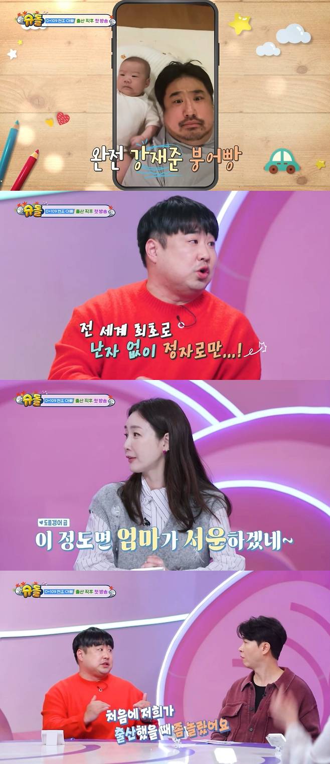 강재준은 "처음에 저희도 출산하고 좀 놀랐다. 첫 아들은 엄마를 닮는다고 해서 쌍꺼풀이 진한 아들이 나올 줄 알았는데 이러고 나왔다"며 인상을 팍 찌푸린 표정으로 웃음을 더했다.
