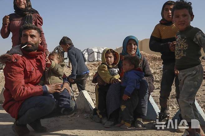 [타브카=AP/뉴시스] 4일(현지시각) 시리아 북부 라카 지역 타브카의 난민 캠프에 쿠르드 난민 가족이 앉아 있다. 알레포와 텔리파트에서 반군을 피해 탈출한 쿠르드 가족 수천 명은 타브카의 쿠르드족 통제 지역 내 임시 대피소와 거리에서 생활하고 있다. 2024.12.05.