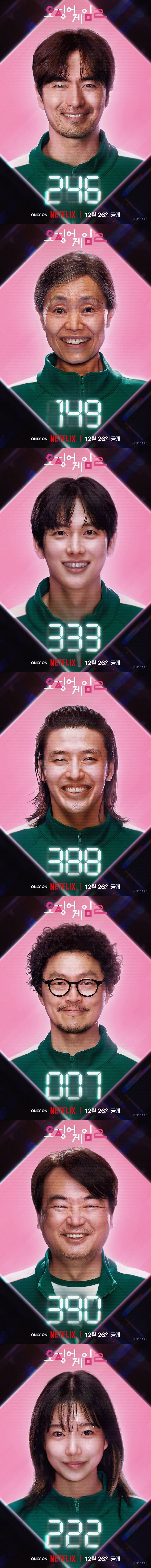 공개된 ‘오징어 게임’ 시즌2 1차 캐릭터 포스터는 작품 속 게임 참가자들이 게임 참가 직전에 찍는 프로필 사진을 연상시킨다. 게임을 끝내기 위해 돌아온 456번 ‘기훈’의 포스터는 웃음기 없는 진지한 표정으로 이 게임이 처음인 다른 참가자들과 대조된다. 순수하고 해맑았던 시즌1 때와는 다른 분위기를 풍기는 ‘기훈’의 모습에서는 게임의 배후를 밝히기 위해 목숨을 걸고 게임에 다시 참여한 그의 집념과 강한 의지를 엿볼 수 있다. 이에 반해, 큰돈을 벌 수 있다는 희망으로 기대에 부푼 8명의 또 다른 참가자들의 프로필은 웃음 가득한 얼굴이거나 미소로 밝은 표정 일색이다. 코인(암호화폐) 투자 유튜버 333번 ‘명기’로 분한 임시완, 붙임성 좋고 넉살 좋은 성격의 388번 ‘대호’ 역의 강하늘은 물론, 아픈 딸을 위해 절실하게 치료비가 필요한 246번 ‘경석’ 역의 이진욱과 성확정 수술을 마치기 위해 돈이 필요한 트랜스젠더 120번 ‘현주’ 역으로 분한 박성훈의 환한 웃음은 역설적인 긴장감을 자 아낸다. 또한, 도박 빚을 갚기 위해 게임에 참여한 007번 ‘용식’과 그의 엄마 149번 ‘금자’를 맡은 양동근과 강애심은 생존이 걸려있는 게임 속 선택의 기로에 선 모자의 이야기로 시즌1과 달리, 게임 밖 관계가 게임 안으로 연결되는 캐릭터들로 새로운 전개를 예고한다. 연락이 끊어졌던 절친 ‘기훈’과 게임장에서 오랜만에 재회한 390번 ‘정배’ 역의 이서환과 잘못된 투자 정보에 속아 거액을 잃은 222번 ‘준희’ 역의 조유리까지. 앞으로 어떤 일이 펼쳐질지 모른 채 웃고 있는 새로운 참가자들의 모습은 예측불가한 게임 속에서 이들이 어떤 일을 겪을지 기대감을 고조시킨다.