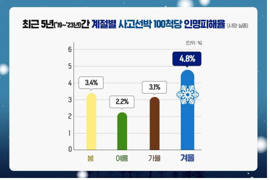 5일 한국해양교통안전공단에 따르면 2019년부터 2023년까지 최근 5년간 겨울철의 해양 사고 발생 건수는 사계절 중 가장 적었다. 그러나 사고 선박 100척당 인명 피해율(사망 및 실종)은 4.8%로 집계됐다. 봄(3.4%), 가을(3.1%), 여름(2.2%)보다 훨씬 높은 수치다.