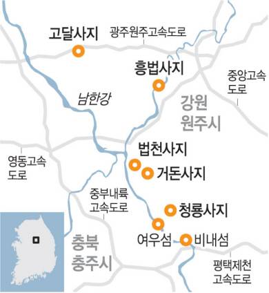 어디 법천사지의 지광국사탑뿐일까. 남한강을 끼고 있는 원주와 경기 여주, 충북 충주 일대에는 비슷한 시기에 이름을 떨친 고승들이 줄줄이 나왔고 그들이 전성기를 누렸던 옛 절터가 있다. 그곳에 미감 넘치는 승탑과 비석이 앞다퉈 세워졌음은 물론이다. 남한강을 끼고 있는 폐사지를 건너다니며 그 자취를 볼 수 있다. 원주의 법천사지와 함께 거돈사지, 흥법사지, 여주의 고달사지, 충주의 청룡사지까지 일대 폐사지를 한 줄로 이으면 흥미진진한 ‘폐사지 여행’이 된다.