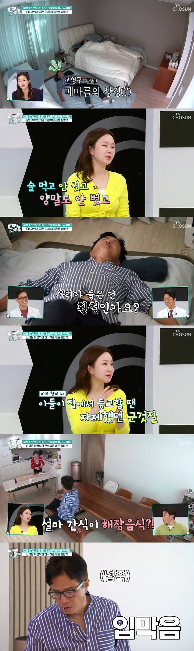 이날 조영구, 신재은 부부의 아침 일상이 공개됐다. 부부는 한 방에서 생활 중이지만, 침대는 같이 쓰지 않았다. 신재은은 침대에, 조영구는 바닥에 누워 양말까지 신은 채 차고 있었던 것. 이에 신재은은 "술 먹고 온 것까진 괜찮은데 양말을 벗고 씻고 자야 하지 않나. 근데 그대로 누워서 잔다"고 토로했다.