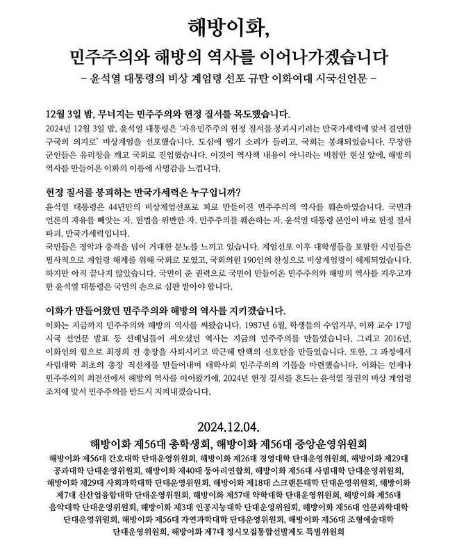 | ▲ 이화여자대학교 총학생회의 윤석열 대통령 비상계엄 선포 규탄 성명 |