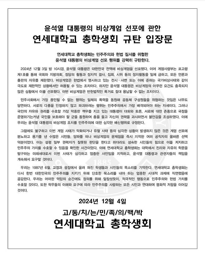 | ▲ 연세대학교 총학생회의 윤석열 대통령 비상계엄 선포 규탄 성명 |