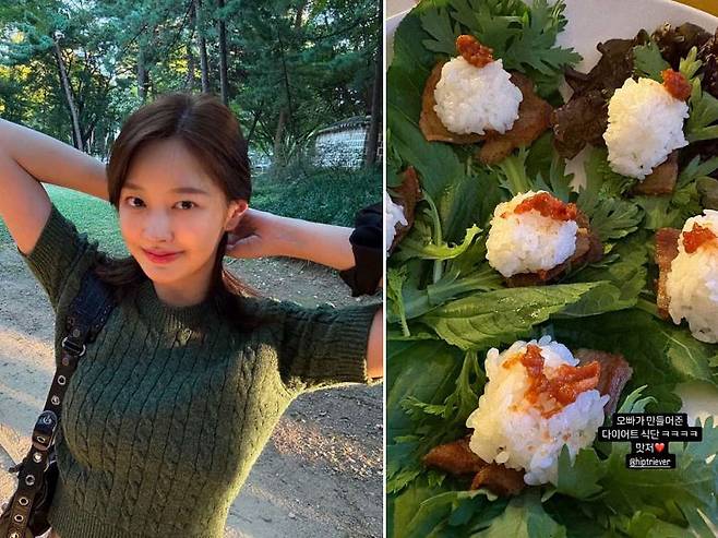 지난 4일 미미는 자신의 인스타그램 스토리에 쌈밥 사진을 올리며 "오빠가 만들어 준 다이어트 식단, 맛저(맛있는 저녁)"라고 말했다.