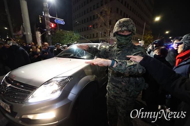 | ▲ 윤석열 대통령이 비상계엄을 선포한 뒤 국회가 비상계엄 해제 결의안을 통과시키기 전, 계엄군이 국회의사당 인근을 지나고 있다. |