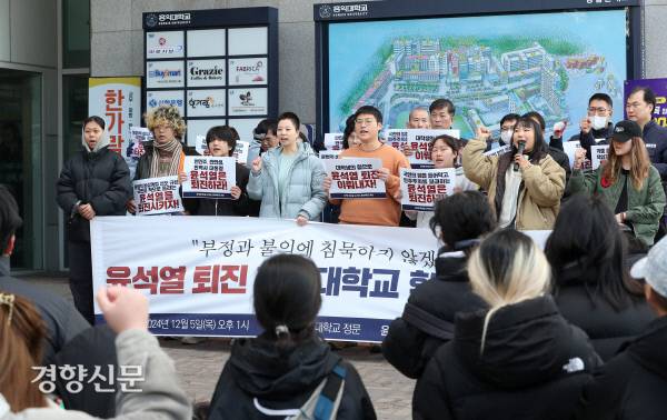 홍익대학교 학생들이 5일 서울 마포구 홍익대학교 정문 앞에서 윤석열 대통령 퇴진 시국선언을 하며 구호를 외치고 있다. 2024.12.5. 정지윤 선임기자