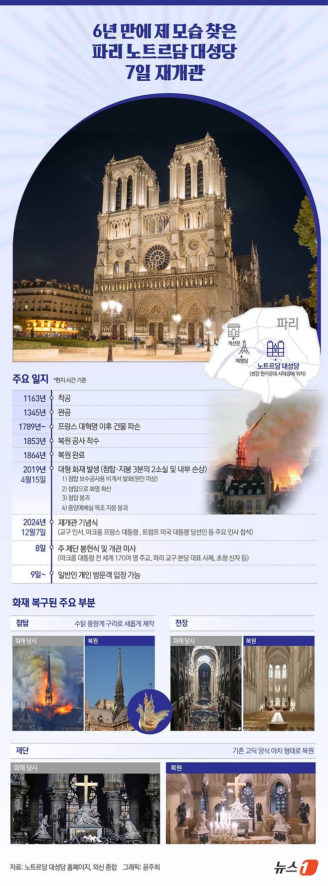 (서울=뉴스1) 윤주희 디자이너 = 2019년 화재로 파괴됐던 프랑스 파리의 노트르담 대성당이 5년의 재건 끝에 7일 재개관을 앞두고 있다. 성당 관계자들은 이날 오는 12월7일 전 세계에 방송되는 예식과 함께 대중에게 성당이 재개관하며, 그 후 일련의 미사, 콘서트 및 기타 행사가 이어질 것이라고 밝혔다.