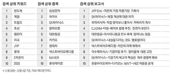 일주일간 투자자들의 이목이 쏠렸던 종목은 삼성전자, 하이브, SK하이닉스, 알테오젠, 대한항공 등이었다. 키워드 검색 순위에서는 국내투자자들의 최대 관심 업종인 반도체가 1위에 올랐고, 국내 증시를 뒤흔든 '계엄'이 2위였다. 보고서 순위에서는 이달 들어 두드러진 상승세를 나타내고 있는 JYP엔터테인먼트에 대한 보고서가 가장 높은 순위에 올랐고, 반도체 업종 중 가장 주목받는 SK하이닉스에 대한 보고서가 2위였다.