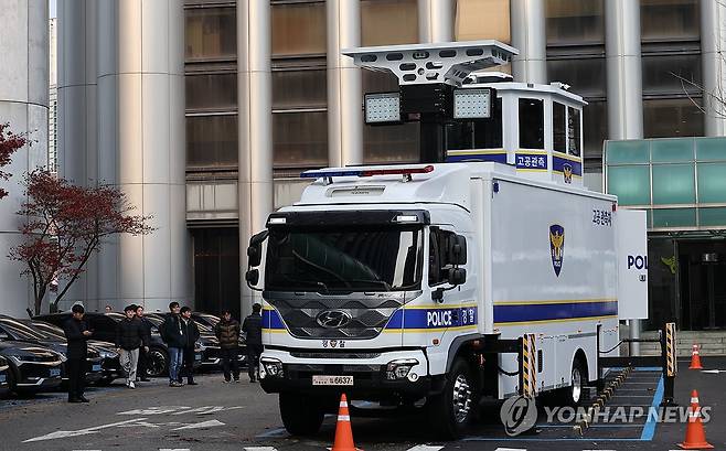 (서울=연합뉴스) 이진욱 기자 = 지난 2일 서울 경찰청 주차장에서 고공관측차량이 보도진에게 공개되고 있다. 이 차량은 최대 높이 7미터로 고정·회전식 카메라, 방송·조명 장비 등이 설치돼 있다. 2024.12.5