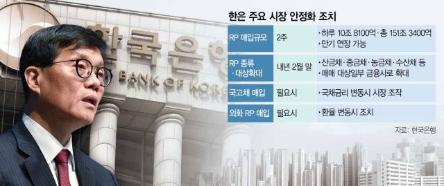 한국은행이 비상계엄 후폭풍을 잠재우기 위해 시장에서 매입하는 환매조건부채권(RP) 규모가 당초 예측을 뛰어넘는 하루 10조 8000억여 원에 달하는 것으로 확인됐다. 한은은 1차로 2주간 RP 매입으로 유동성을 공급한 뒤 상황에 따라 기간을 연장하기로 했다. 통화 당국이 대규모 자금을 풀어 시장 경색을 푸는 것은 맞지만 계엄 선포에 따른 경제적 대가가 크다는 지적이 나온다.