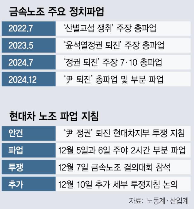 3일 윤 대통령의 계엄 선포와 철회 이후 민주노총의 파업 양상은 완전히 달라졌다. 민주노총은 올해 총파업을 하지 않고 시민단체 연대 집회와 정책 토론을 중심으로 정권 퇴진 운동을 해왔다. 올해 민주노총 파업은 철도노조·서울지하철노조·학교비정규직노조 등 공공 부문 파업으로 마무리될 것이라는 평가가 우세했다. 하지만 계엄 선포 사태 이후 금속노조가 파업에 나서면서 민주노총 파업이 공공에서 민간으로 확대되고 있다. 게다가 파업들은 불법성이 더 짙은 정치 파업이다. 현대차의 경우 이미 올해 임금 및 단체협상이 타결됐다. 추가 파업은 근로 조건 개선을 목적으로 한 파업이 아니라는 논란이 뒤따를 수 있다. 또 현대차 노조는 노동위원회 조정 중지, 조합원 찬반투표 등 적법한 파업 절차를 밟지 않았다. 금속노조에 따르면 합법 파업을 할 수 있는 쟁의권이 있는 사업장은 약 100곳이다. 약 400곳은 현대차처럼 쟁의권이 없다. 하지만 이들 사업장도 정치 파업에 나설 수 있는 것으로 알려졌다.