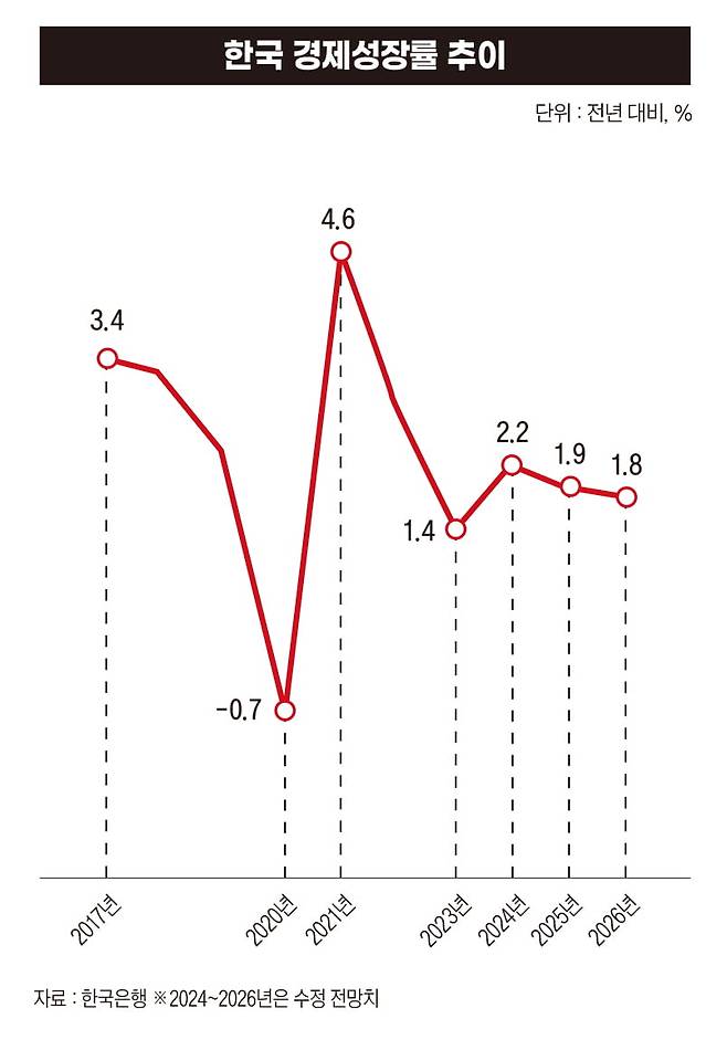 통상적으로 한국의 잠재성장률로 여겨지는 수준은 2%다. 1%대 성장률을 2년 연속으로 내다본 건 한국이 저성장 국면에 진입할 가능성을 시사하는 것과 다름없었다.