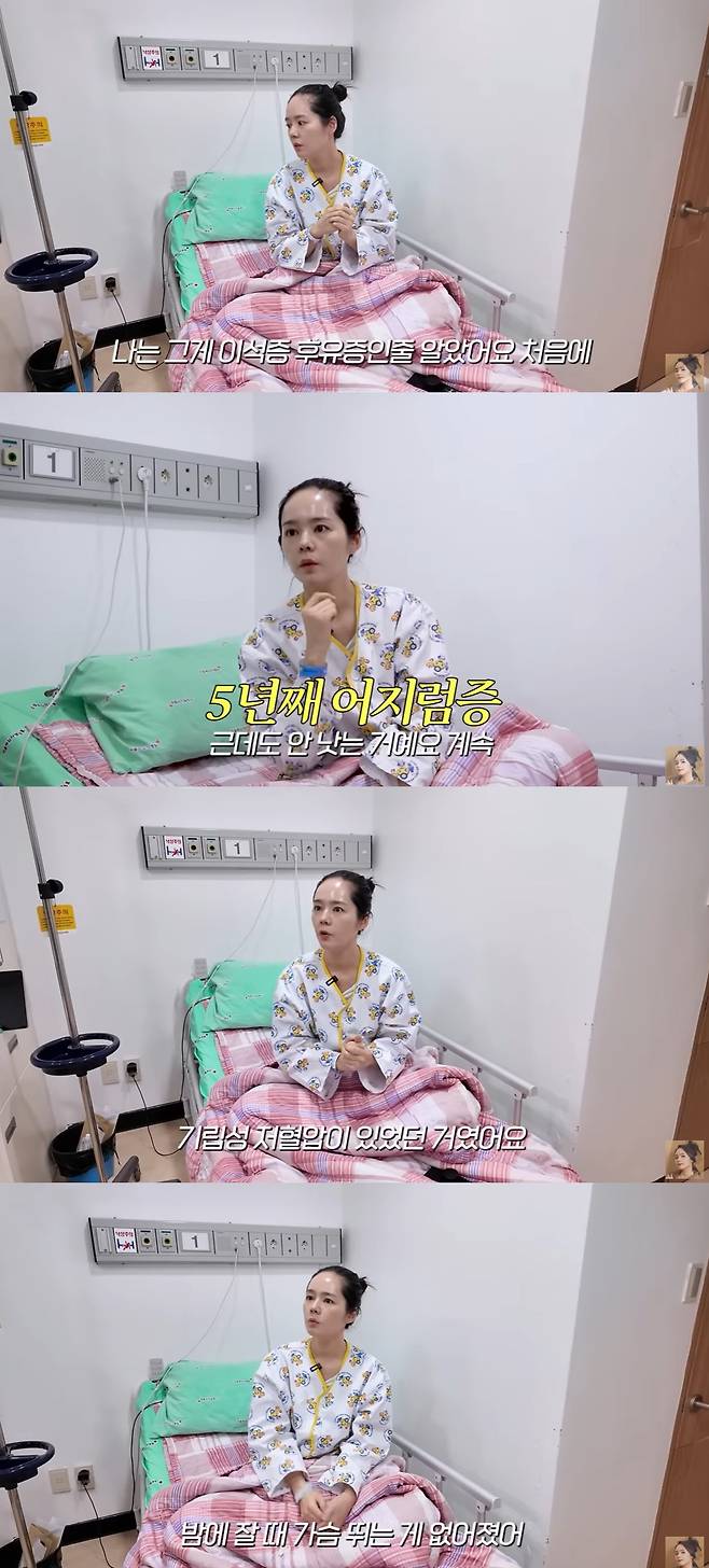 그는 "쓰러져서 남편 붙잡고 기어서 들어와 간호사들이 휠체어를 끌어줬다"며 심각했던 당시를 회상하며 "원인불명 어지럼증이 계속 있었는데 처음엔 이석증 후유증인 줄 알았다"고 털어놨다.