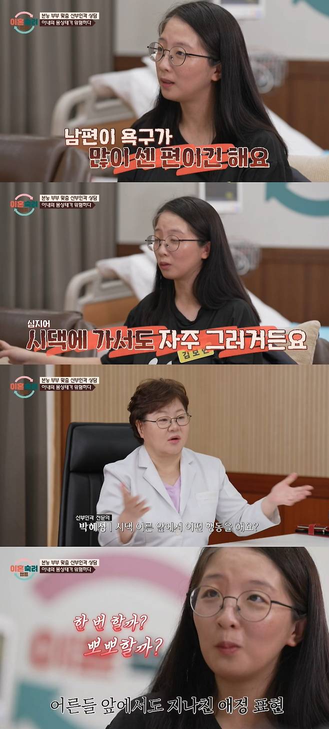 때와 장소를 가리지 않고 스킨십을 요구하는 남편에 아내는 "애들 있을 때는 싫다. 애들도 솔직히 다 알 거 안다. 아이들 앞에서는 자제해야 되지 않을까 싶다. (남편) 욕구가 센 편이긴 하다"며 "시댁에 가서도 자주 그런다"고 밝혀 충격에 빠트렸다.