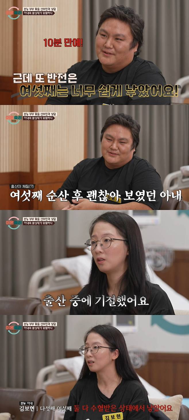 남편의 주장과는 달리 출산할 때 어려웠던 점에 대해 아내는 "(출산 중에) 기절했다. 다섯째 여섯째 둘 다 수혈받은 상태에서 낳았다. 제가 힘을 줬는데도 불구하고 중간에 제가 피를 많이 쏟아서 그런지 의사 선생님도 저를 깨웠다"며 "출산이 무섭지 않다고 생각했는데 기절하니까 무섭다"고 아이와 산모가 모두 위험했던 당시를 회상했다.