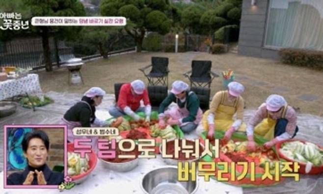 이날 김용건-신성우-김원준-신현준-김범수은 지난 방송에 이어, '단체 김장' 2탄을 선보였다. 이들은 "머리를 염색하듯이, 사이사이 빗질하듯 김칫소를 넣으라"는 큰형님 김용건의 조언에 맞춰 김칫소 버무리기에 돌입했고, 어린 시절의 '김장 품앗이'를 추억하며 수다꽃을 피웠다. 같은 시간 7명의 아이들은 너나 할 것 없는 '아빠 자랑 대회'에 돌입했고, 스튜디오에서 뒤늦게 영상을 지켜본 꽃대디들은 흐뭇한 미소를 감추지 못했다. 50포기의 김장이 마무리되자, '꽃대디'들은 신현준의 아내 김경미가 준비한 수육과 배추전, 굴김치, 홍어회와 과메기 등을 먹으며 즐거워했고, 곧이어 스케줄을 마친 김구라가 도착해 '꽃대디 6인방 완전체 회동'이 성사됐다. 식사 후 '꽃대디'들은 김용건-김구라에게 안대를 씌운 채, 각 가문의 자존심을 걸고 만든 '이색 김치' 블라인드 테스트에 돌입했다. 각각 '안성재'와 '백종원'으로 변신한 김용건-김구라의 냉철한 평가 끝에, 이색 김치 전쟁의 승자는 비트와 콜라비로 '루이비X 물김치'를 완성한 '김장 마스터' 신성우에게 돌아갔다. 이어서 '꽃중년 2세'들의 '장기자랑 대회'가 시작됐는데, 신성우의 첫째 아들 태오는 '해리포터'로 변신해 공이 뜨는 마술을 선보였고, 신현준의 둘째 아들 예준은 현란한 비보잉 댄스로 "당장 계약하자"는 열광적인 반응을 끌어냈다.