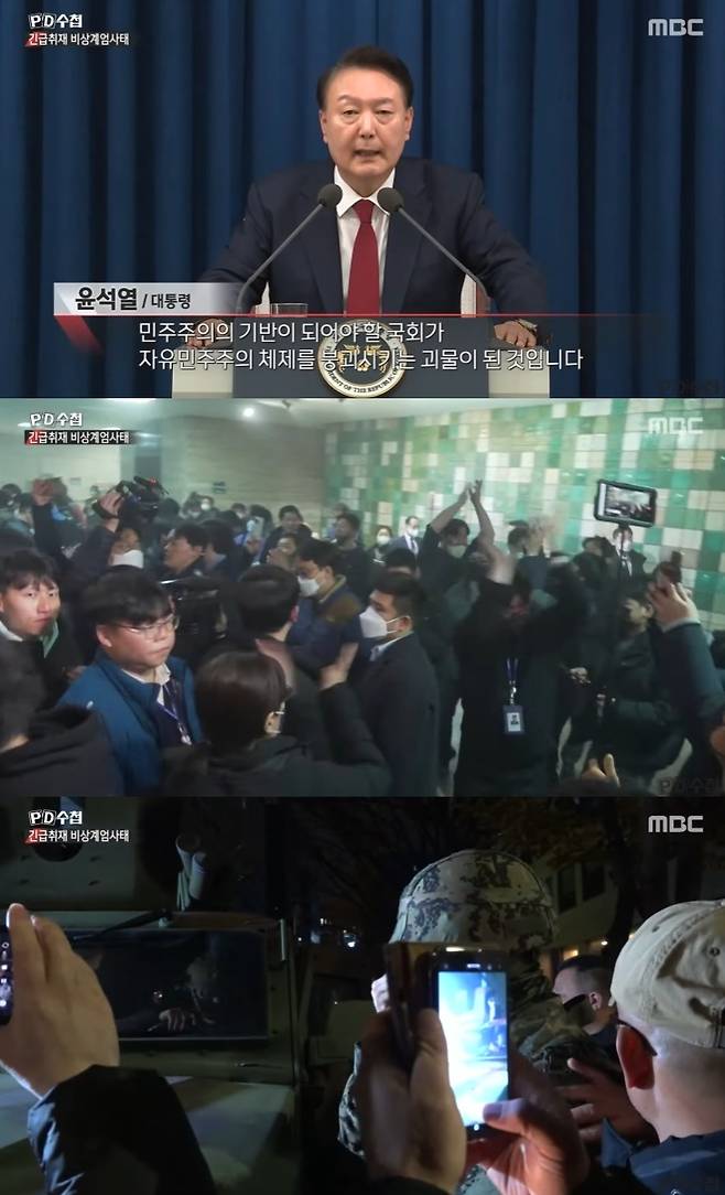 이날 방송에서는 비상게엄이 선포된 날 밤 국회 앞 상황이 담겼다. 늦은 시간임에도 불구하고 국회 앞에는 수많은 시민들로 북새통을 이뤘다. 'PD수첩' 측은 계엄군이 출동한 것은 극히 일부의 장소 뿐, 방송사(KBS, MBC), 서울역 등 주요 장소들에 대한 점령도 전혀 이뤄지지 않았다고 지적했다.