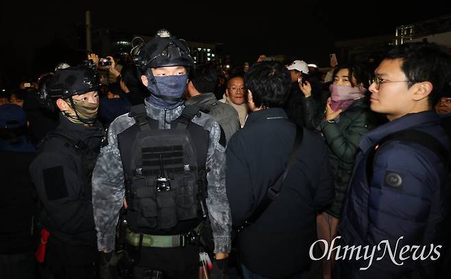 | ▲ 윤석열 대통령이 3일 저녁 기습적으로 비상계엄을 선포한 가운데, 국회 주변에 등장한 무장한 계엄군에게 시민들이 항의하고 있다. |