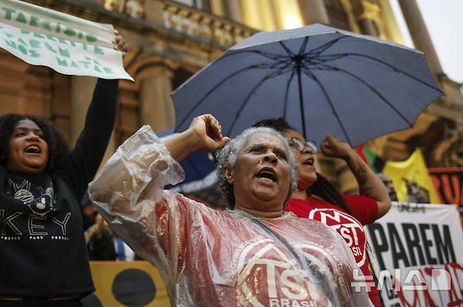 [상파울루=AP/뉴시스] 5일(현지시각) 브라질 상파울루에서 시위대가 흑인과 빈곤층을 대상으로 한 경찰 폭력의 종식을 촉구하며 구호를 외치고 있다. 2024.12.06.