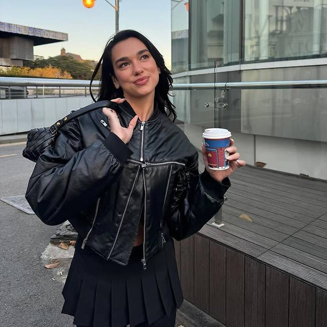 미술관에서 따뜻한 챔프커피를 테이크아웃해 밖으로 나선 두아, 아웃핏마저 완벽한데요. 블랙 레더 보머재킷에 플리츠 미니스커트를 레이어드해 시크하면서도 트렌디한 젠지룩을 선보였습니다.