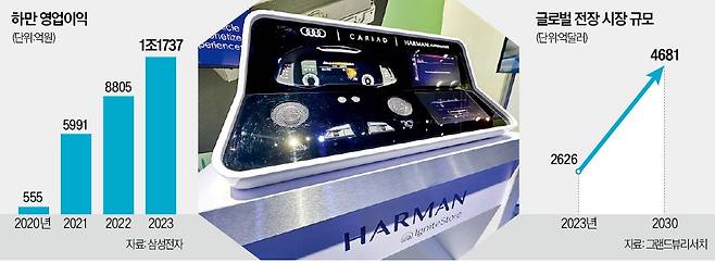 삼성이 전장에 힘을 주는 건 자동차의 모든 기능이 디지털로 바뀌면서 관련 시장이 폭발적으로 성장하고 있어서다. 그랜드뷰리서치에 따르면 지난해 2626억달러(약 372조원)였던 세계 전장 시장 규모는 2030년 4681억달러(약 664조원)로 커질 전망이다.