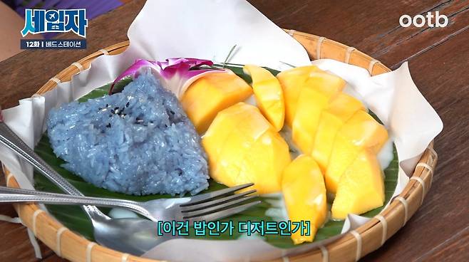 망고밥은 코코넛 우유를 뿌린 밥과 망고를 함께 먹는 음식. "생각보다 맛있다"는 지효의 추천에 망고밥을 먹은 감독은 급격히 표정이 어두워졌고, "남은 망고밥은 입자(지효)가 맛있게 먹었다"는 자막이 노출됐다.