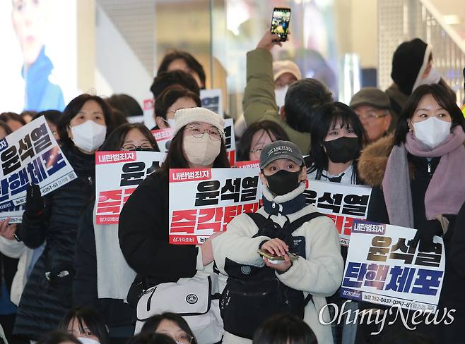 집회장 주변에서 탄핵 손팻말을 든 1명을 중심으로 모여있던 고등학생들이 '12.3 윤석열 내란 사태'를 지켜보며 든 생각을 털어놨다. 이들은 막 수능을 마친 고3 학생. 너나없이 입을 모은 건 지난해 본 영화 속 장면을 현실에서 경험할 줄 몰랐다는 이야기였다. 정아무개 학생은 "탄핵이 통과됐으면 한다"면서 강한 바람을 전했다.