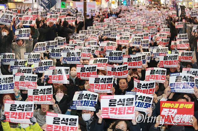 | ▲ '군사반란 계엄폭거 내란범죄자 윤석열 즉각 퇴진 부산시민대회'가 6일 부산 서면 쥬디스 태화 옆 하트조형물 쪽에서 열리고 있다. '윤석열 즉각 퇴진' 손팻말을 들고 집회에 참여한 10대와 20대들. |