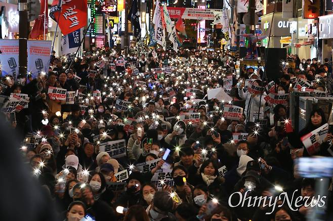 | ▲ '군사반란 계엄폭거 내란범죄자 윤석열 즉각 퇴진 부산시민대회'가 6일 부산 서면 쥬디스 태화 옆 하트조형물 쪽에서 열리고 있다. 스마트폰 LED 촛불을 꺼낸 참석자들. |