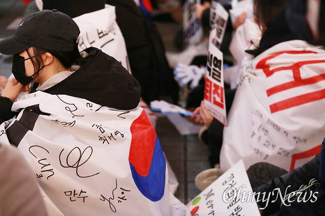 | ▲ '군사반란 계엄폭거 내란범죄자 윤석열 즉각 퇴진 부산시민대회'가 6일 부산 서면 쥬디스 태화 옆 하트조형물 쪽에서 열리고 있다. 태극기를 두르고 참여한 학생들. |