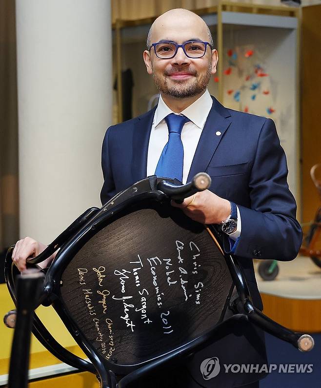 (스톡홀름=연합뉴스) 김도훈 기자 = 2024 노벨 화학상 수상자인 구글 딥마인드 최고경영자인 데미스 허사비스가 6일(현지시간) 스웨덴 스톡홀름 노벨상박물관에서 수상자만을 위한 특별한 방명록인 박물관 레스토랑 의자에 서명을 남긴 뒤 의자를 들고 포즈를 취하고 있다. 2024.12.6