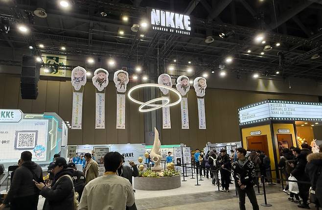 지난해 AGF와 동일한 위치에 배치된 니케 부스는 현장 이벤트 전용 무대 스테이지, 포토존, 코스프레존, 미니게임존, 팬아트 갤러리, 굿즈 판매존으로 구성됐다.