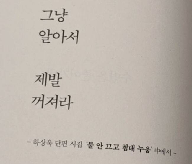 이들에 앞서 지드래곤도 윤석열 대통령의 비상계엄의 비판하는 게시물에 ‘좋아요’를 누르며 간접적으로 분노의 뜻을 함께했다. 지난 4일 하상욱은 자신의 인스타그램에 단편 시집 ‘불 안 끄고 침대 누움’ 속 한페이지를 촬영해 공유했다. 해당 사진에는 ‘그냥 알아서 제발 꺼져라’는 문장이 담겼다.
