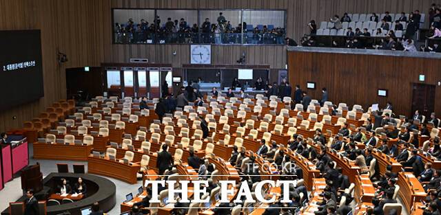 尹 탄핵 표결에 본회의장 나간 국민의힘 '나홀로 자리한 안철수' [TF사진관]