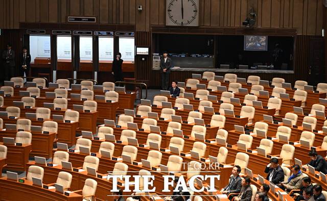 [더팩트ㅣ국회=이새롬 기자] 윤석열 대통령 타핵 표결을 앞둔 7일 서울 여의도 국회 본회의장에서 안철수 국민의힘 의원이 자리를 지키고 있다. 안 의원을 제외한 모든 국민의힘 의원은 표결에 앞서 본회의장을 이탈했다.