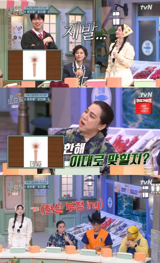 이날 '놀토' 간식 게임 코너에서는 거북이 메론빵을 걸고 가수들의 응원봉 이름을 맞추는 퀴즈가 진행됐다. 모든 멤버들이 통과한 가운데, 한해와 다현만이 남아 고전하던 상황.
