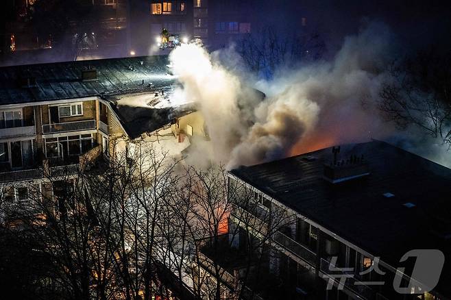 (헤이그 AFP=뉴스1) 우동명 기자 = 7일(현지시간) 네덜란드 헤이그의 3층 아파트에서 폭발과 화재가 발생해 최소 3명이 숨진 현장서 불길과 연기가 솟아 오르고 있다. 2024.12.08