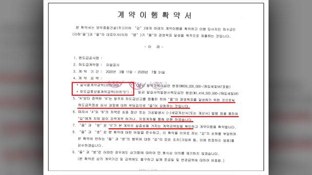 양우종합건설은 업 계약서는 수급사업자에게 주고, 도급 금액의 82%에 미달하는 실제 계약서는 자신이 보관하는 ‘이중계약’을 체결한 것으로 파악됐습니다.