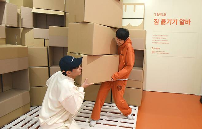 경품 혜택을 누릴 수 있는 ‘언박싱 알바존’도 마련됐다. 팝업스토어에 방문한 이용객들을 대상으로 당근머니 최대 100만원, 무신사 할인 쿠폰, 원마일 워크웨어 제품 중 하나를 100% 증정하는 ‘언박싱 알바’ 이벤트가 진행된다.
