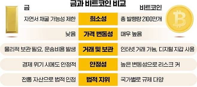 비트코인은 블록체인 기술이 적용돼 거래의 투명성과 보안이 보장된다. 중앙은행과 정부의 통제에서 벗어나 있다. 경제 불확실성이 커지고 법정화폐의 가치가 하락했을 때 대안으로 여겨지기도 한다. 금과 비교해 거래와 보관이 간편하고 비용이 낮다는 장점이 있다.