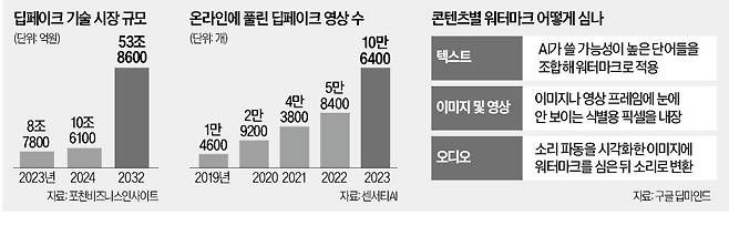 영상에 사람 얼굴을 합성한 딥페이크 콘텐츠가 쏟아지자 빅테크가 대응에 나섰다. 구글이 인공지능(AI) 생성 이미지, 영상, 음성에 이어 텍스트에도 워터마크를 심었다. ‘디지털 흔적’으로 불리는 이 기술을 공유하고자 빅테크들이 자발적으로 꾸린 연합체는 회원사가 200여 곳을 넘었다. 이와 반대로 워터마크를 벗겨주겠다는 업체도 등장하면서 온라인 세계에서 기술 전쟁이 벌어지고 있다.
