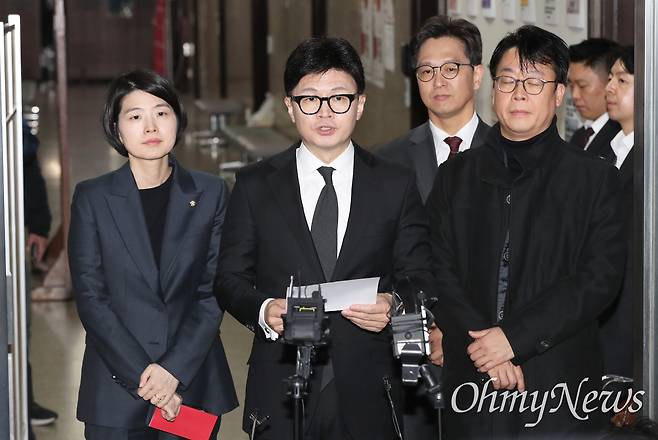 | ▲ 한덕수 국무총리와 국민의힘 한동훈 대표가 8일 오전 서울 여의도 국민의힘 당사에서 국정 수습 방안을 담은 공동 담화문을 발표하기 위해 회견장으로 들어서고 있다. |