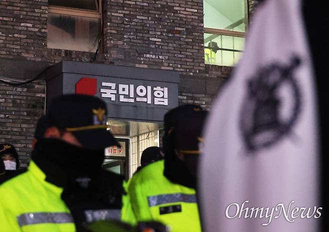 | ▲ 7일 저녁 12.3내란 사태를 일으킨 윤석열 대통령에 대한 국회 탄핵소추안 표결이 국민의힘의 방해로 불성립되어 무산된 가운데, 시민들의 항의시위가 계속되는 국회앞 국민의힘 당사에 경찰이 배치되어 있다. |