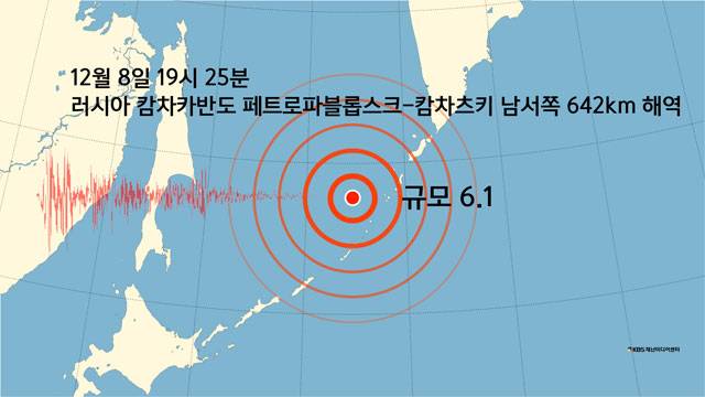 오늘(8일) 저녁 7시 25분에 러시아 캄차카반도 페트로파블롭스크-캄차츠키 남서쪽 642km 해역에서 규모 6.1의 지진이 발생했습니다.