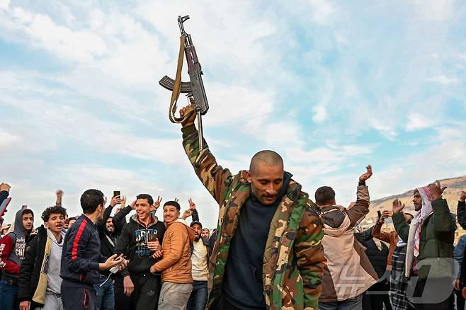 (다마스쿠스 AFP=뉴스1) 이창규 기자 = 시리아 반군이 7일(현지시간) 수도 다마스쿠스를 점령했다고 밝혔다. 사진은 시리아 국민들이 다마스쿠스의 우마이야드 광장에서 반군의 승리를 축하하는 모습. 2024.12.8.