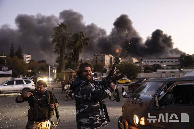 [다마스쿠스=AP/뉴시스] 8일(현지시각) 시리아 다마스쿠스에서 시리아 정부의 붕괴에 환호하는 두 남성이 공중에 총을 쏘고 있다. 다마스쿠스를 장악한 반군은 "다마스쿠스가 해방됐다"라고 선언했고 바샤르 알아사드 시리아 대통령은 도피한 것으로 알려졌다. 2024.12.09.
